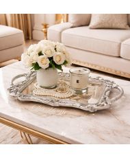 Le plateau décoratif MONICA apporte une touche moderne et sophistiquée à votre intérieur grâce à sa finition argentée et à son fond miroir qui reflète subtilement la lumière. Son design épuré en fait un accessoire décoratif aussi pratique qu’esthétique.
